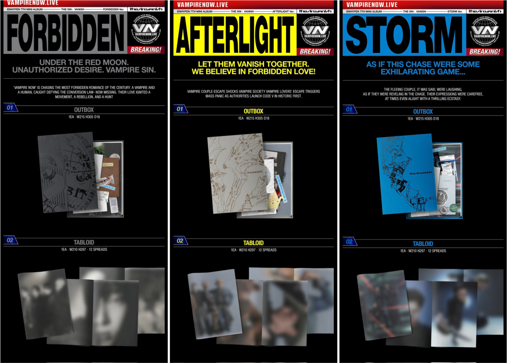 엔하이픈의 앨범은 여러 버전으로 판매하고 있는데요, 전반적으로 ‘VAMPIRE NOW’ 홈페이지에서 보였던 톤앤매너를 그대로 이어온 구성이 눈에 띕니다. 파일철 형태의 패키지, 각종 스티커와 오브제 등 작은 요소까지 세계관을 반영해 꾸며져 있고요.