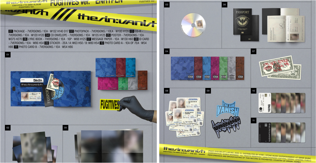 그중 에디터가 특히 인상 깊게 본 버전은 ‘FUGITIVES’입니다. 도피 중인 뱀파이어라는 콘셉트에 맞춰, 가사집을 여권처럼 제작하고 신분증, 달러 지폐, 카드 등 소품을 함께 구성했죠.