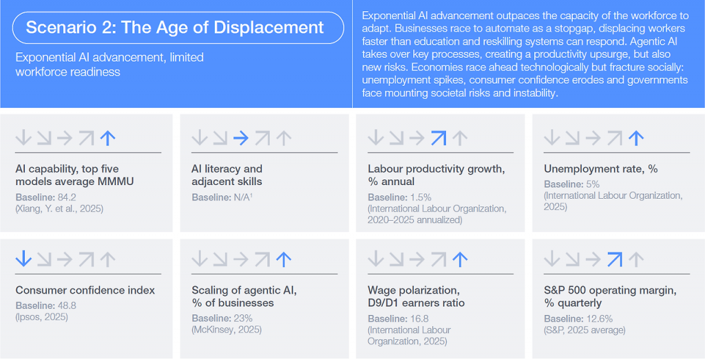 대체 시대 시나리오는 AI의 기하급수적인 발전 속도가 노동자들의 적응 능력을 압도할 때 발생한다. 교육 및 훈련 시스템이 전통적인 방식에 머물러 있는 사이 기술은 비약적으로 진보하고, 기업들은 부족한 인재를 보충하기 위한 미봉책으로 자동화를 가속화한다. 이 시나리오에서 AI 에이전트는 주요 비즈니스 프로세스를 장악하여 단기적인 생산성 향상을 이끌어내지만, 사회적으로는 극심한 균열과 불안정을 초래한다.