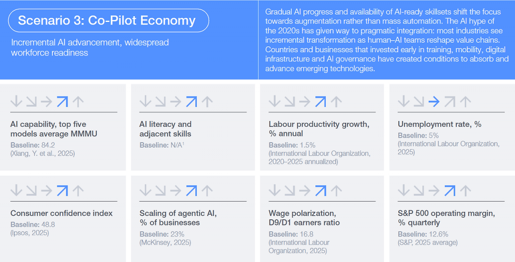 코파일럿 경제 시나리오는 점진적인 AI 발전과 광범위한 인재 준비도가 결합된 가장 균형 잡힌 미래를 상정한다. 2020년대 중반 AI에 대한 과도한 거품이 걷힌 후 기술 도입은 실용적이고 점진적인 방식으로 진행되며, 대량 자동화보다는 인간의 능력을 강화하는 증강(Augmentation)에 초점이 맞춰진다. 일찍부터 교육과 인프라에 투자한 국가와 기업들은 AI를 안전하게 흡수하고 인간의 전문성을 고도화하는 환경을 구축한다.