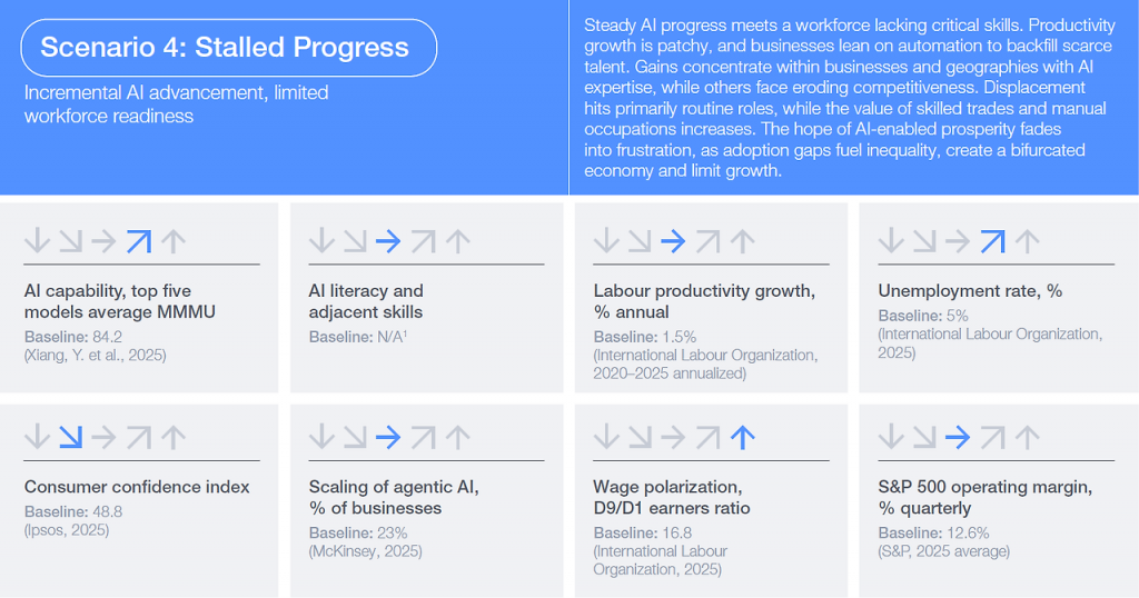 정체된 진보 시나리오는 AI의 발전이 지연되는 가운데 인력의 준비도마저 부족한 정체된 미래를 그린다. AI 모델의 한계가 드러나고 높은 컴퓨팅 비용과 규제 장벽으로 인해 기술 혁신의 속도가 둔화된다. 동시에 노동 시장은 필요한 기술을 갖춘 인재의 부족으로 인해 혁신적인 비즈니스 모델을 수용하지 못하며, 기업들은 기술을 통한 근본적인 혁신 대신 부족한 인력을 자동화로 채우는 소극적인 대응에 머문다.