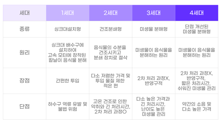 싱크대 설치형이었던 1세대를 지나 지금 우리에게 익숙한 건조 분쇄형과 새롭게 등장한 3세대 미생물 분해형까지 다양한 처리 방식의 제품들이 등장하고 있죠.