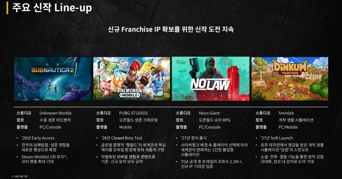 크래프톤은 현재 다수의 신작 프로젝트를 동시에 추진하고 있으며, ▲서브노티카2 ▲팰월드 모바일 ▲딩컴 투게더 등 기존 인기 IP 기반 신작도 순차적으로 선보일 예정이다. 회사는 2027년까지 다수의 신규 IP를 확보하겠다는 계획을 밝히고 있다.