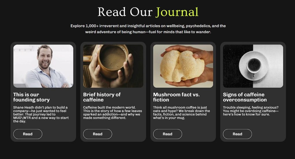 - 예술가, 성공한 기업가들의 모닝 루틴, 커피를 끊고 더 나은 삶을 살고 있는 실제 고객들을 인터뷰한 다큐멘터리 필름, 불안이나 번아웃에 대처하는 명상법 등