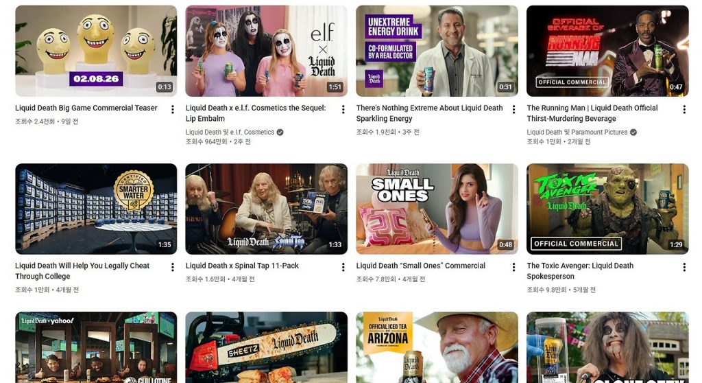 이전 글에서도 다룬 적이 있는 리퀴드데스는 마케팅 영역에서 가장 재미없는 카테고리이자 레드오션인 ‘생수’ 시장에서 시선을 사로잡는 비주얼과 콘텐츠로 연 매출 3,000억을 만들어낸 브랜드입니다. 스스로를 생수 회사가 아닌 ‘엔터테인먼트 회사’라고 규정할 정도로 콘텐츠 마케팅에 진심이죠. 리퀴드데스의 콘텐츠들 역시 브랜드의 관점, 제품과 긴밀하게 연결되어 있습니다.