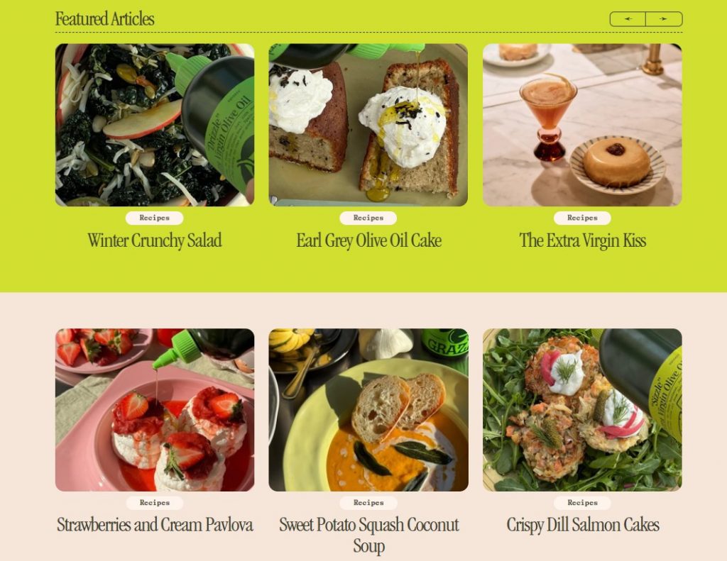 - 주방에서 뚝딱 만들 수 있는 올리브 오일 활용 요리 레시피 (전용 캡의 뛰어난 사용성 강조), 재료가 오일에 튀겨지는 소리와 비주얼이 강조된 콘텐츠, 그라자를 활용해 만든 요리 먹방 등