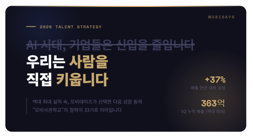 AI가 업무를 대체하기 시작하면서, 많은 기업들이 신입 채용 문을 좁히고 즉시 전력이 될 경력직 영입에 집중하고 있습니다. 채용 시장의 무게추가 경력직으로 빠르게 쏠리는 지금, 반대 방향을 선택한 기업이 있습니다. 종합 미디어 콘텐츠 기업 모비데이즈입니다.