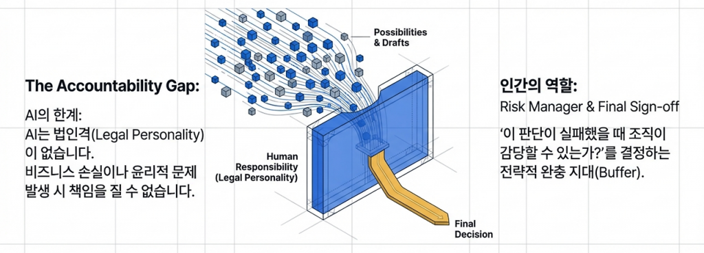 전문가들은 AI가 시니어의 ‘판단 능력’은 상당 부분 모방하거나 추월할 수 있지만, ‘책임의 주체’로서의 지위는 결코 대체할 수 없다는 점에 주목한다. AI는 과거의 장애 이력, 사용자 패턴, 방대한 디자인 데이터를 바탕으로 시니어 전문가보다 훨씬 정교한 시뮬레이션 결과를 내놓을 수 있다. 그러나 AI의 판단이 실패하여 비즈니스에 막대한 손실을 입히거나 법적 문제를 야기했을 때, AI는 그 결과를 자신의 문제로 끌어안거나 도덕적, 경제적 책임을 질 수 있는 법인격이 없다. 결국 실패한 판단 이후의 세계를 정리하고 조직 내에서 신뢰를 회복하며 수습하는 완충 지점에는 반드시 인간 시니어가 존재해야 한다.
