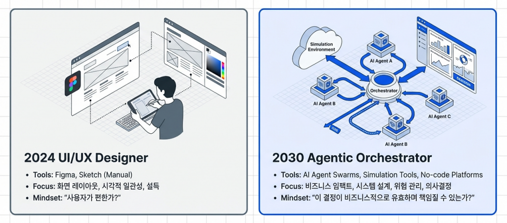 시니어 디자이너의 존재 이유는 단순히 정답을 맞히는 숙련도에 있는 것이 아니라, “이 판단이 실패했을 때 우리 조직이 감당할 수 있는 범위는 어디까지인가?”를 결정하는 전략적 위험 관리에 있다. AI가 생성한 수천 개의 최적안 중 하나를 선택하고 “내가 이 결정을 내렸으며 결과에 책임을 지겠다”라고 선언하는 행위는 오직 인간만이 수행할 수 있는 리더십의 영역이다. 따라서 미래의 시니어는 실무를 더 잘하는 사람이 아니라, AI 에이전트들이 도출한 수많은 결과물을 비판적으로 검토하고 비즈니스 맥락에 맞게 최종 조율하는 ‘의사결정자’로 남게 된다.