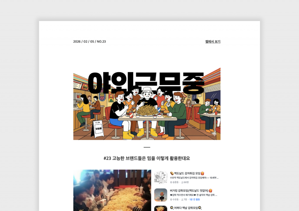 야근중에서는 한 주간 오프라인 마케팅의 흐름 파악은 물론, 주요 팝업 일정까지 알려 주어 브랜드 퍼포먼스나 캠페인 기획에 직접 참고하기 좋아요. 또 주제에 따라 추천 아티클까지 포함되니 오프라인 채널을 고민하는 마케터들에게 꼭 필요한 뉴스레터예요.