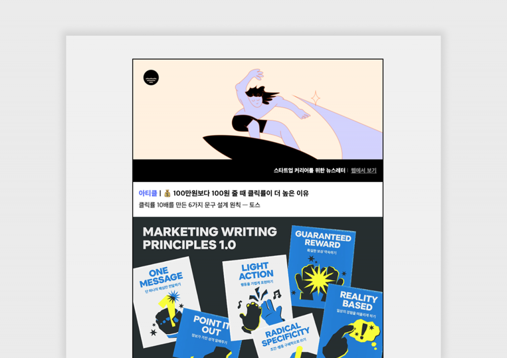 서핏 위클리는 매일 성장하는 사람들을 위한 커리어 플랫폼 ‘서핏’에서 운영하는 주간 뉴스레터로, 커리어 성장과 실무 감각을 넓히는 데 도움이 되는 콘텐츠를 선별해 전달해요. 서핏 플랫폼에서 한 주간 주목받은 글과 서핏 팀이 직접 추천한 아티클을 중심으로 큐레이션되어, 트렌드 분석부터 사례, 구체적인 실행 전략, 제품 개발 인사이트까지 실무에 바로 연결할 수 있는 콘텐츠 비중이 높은 것이 특징이에요. 또한 기획·디자인·마케팅 등 분야별로 정리된 구조라 다양한 직무의 관점을 비교하며 읽기 좋고, 새로운 아이디어를 확장하는 데에도 도움이 되는 레터예요.