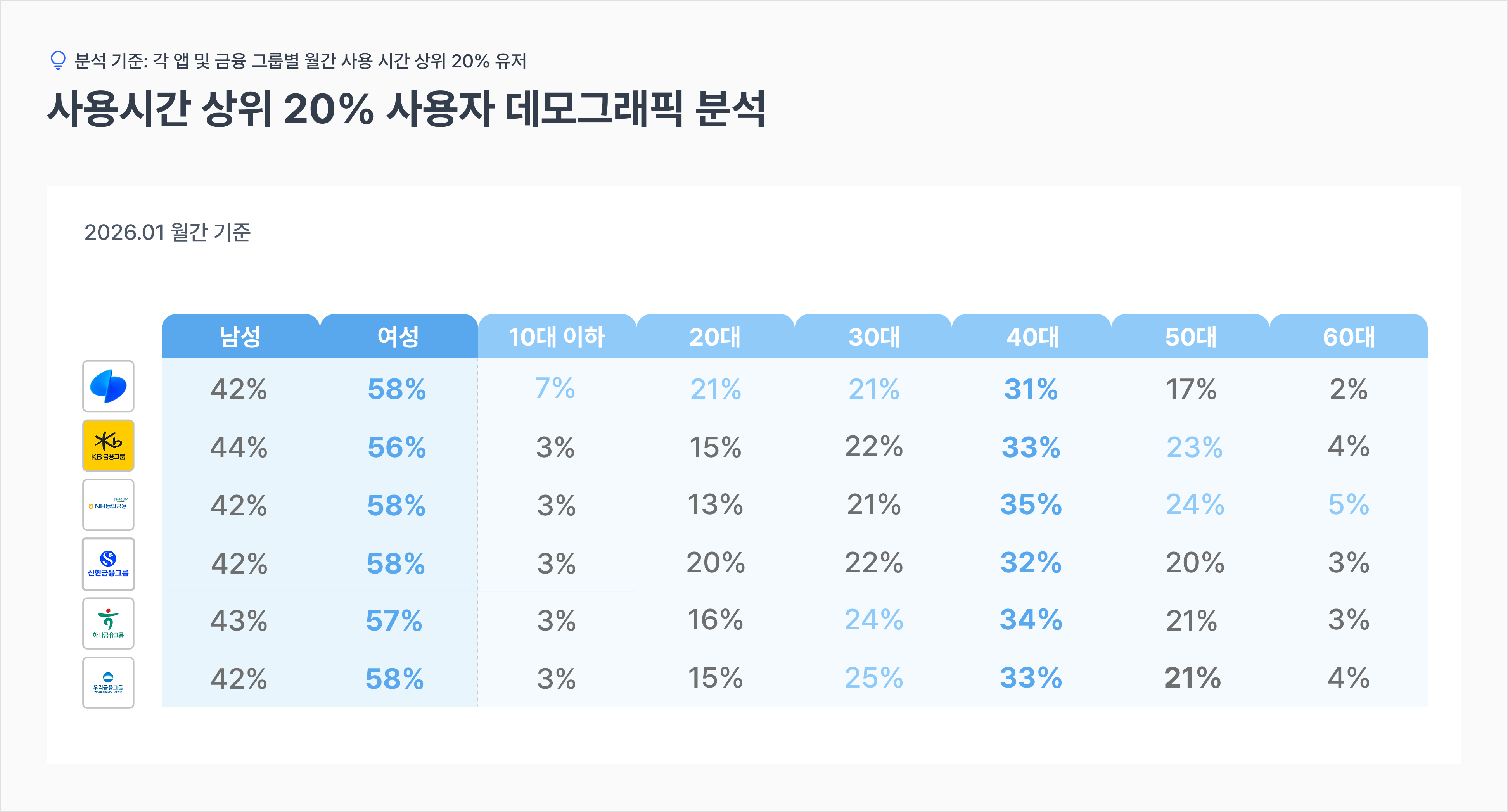반면 시중 금융 그룹은 자산 관리의 핵심인 4050 세대에서 독보적인 지배력을 유지하고 있습니다. KB(33%), 신한(32%), 하나(33%), 우리(34%) 등 주요 그룹사 모두 40대 사용자가 상위권을 차지하고 있으며, 특히 NH농협은 40대 비중 35%에 달해 가계 금융의 실질적 결정권자를 가장 두텁게 확보하고 있습니다. 50대 비중 역시 20~24% 수준을 기록하며 토스(17%)보다 높은 수치를 보이는 것은, 시중 금융 그룹이 ‘전통 금융사’라는 본질적인 영역에서 여전히 세대적 우위를 점하고 있음을 보여줍니다.