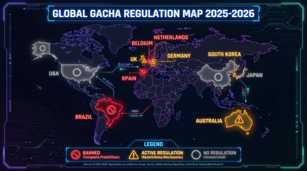 규제 측면에서 보면, 벨기에와 네덜란드는 이미 확률형 루트박스를 도박으로 규정하고 금지했다. 브라질은 2025년 9월 청소년 온라인 보호법을 통해 미성년자 대상 게임의 루트박스를 금지했다. 스페인도 유사한 규제를 도입했다.