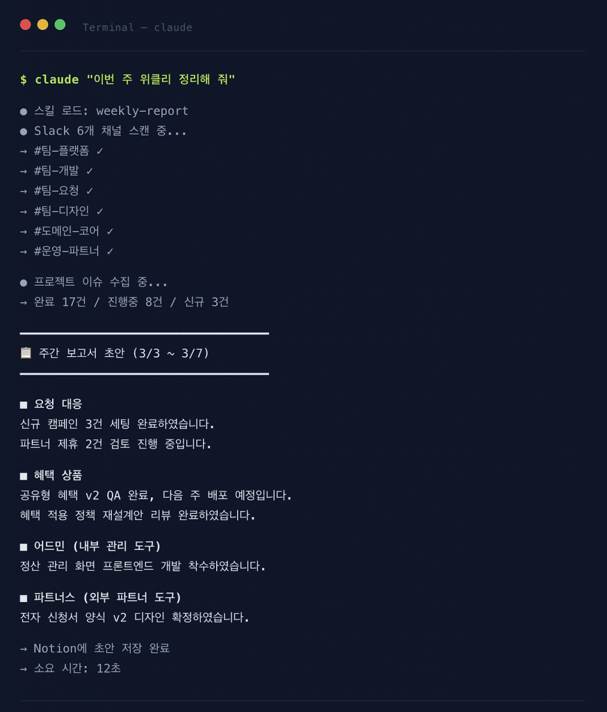 한 줄 명령어로 주간 보고서 초안이 완성되는 순간, 느꼈어요. 이건 단순히 “편해진” 게 아니라, 시스템이 만들어지고 있다는걸요. 파일 하나, 스킬 하나를 추가할 때마다 AI가 할 수 있는 일이 누적되고 있었어요.
