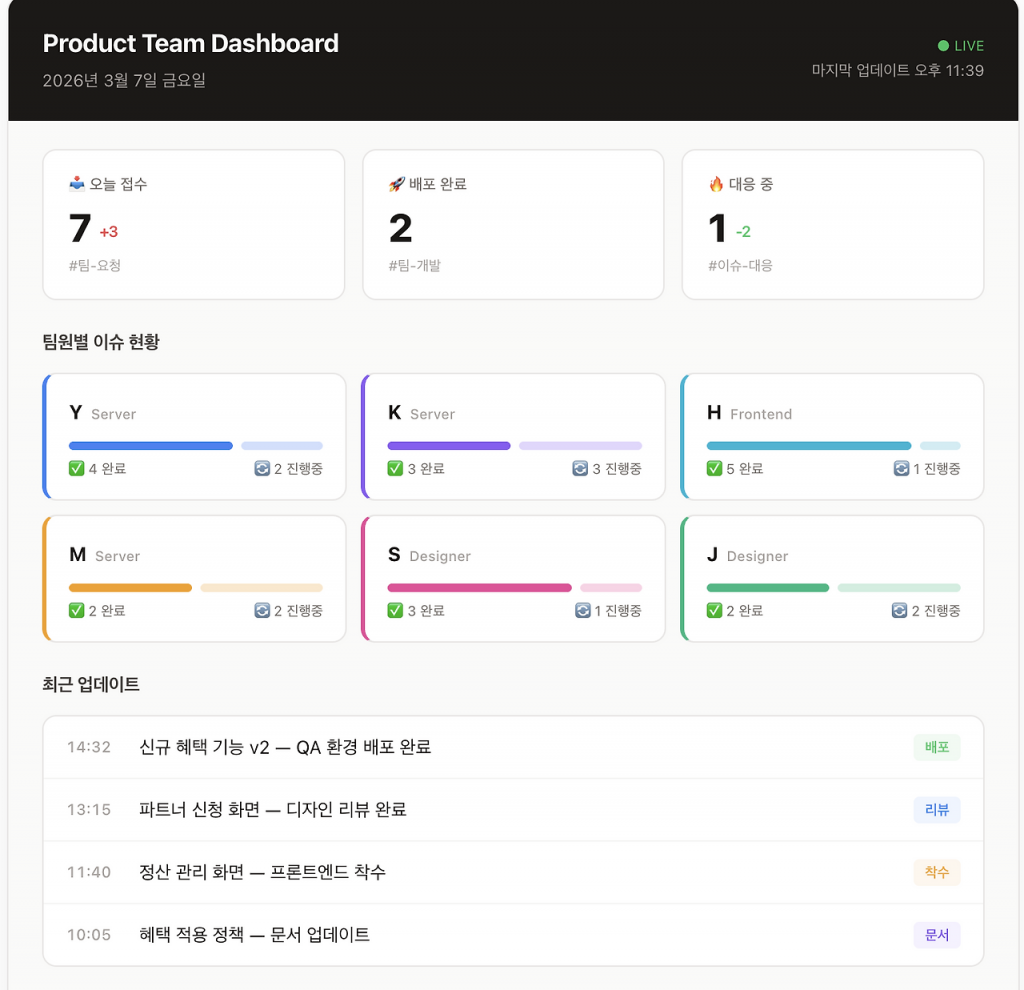 우리 팀은 프로젝트 관리 도구에서 이슈를 관리하고, 메신저에서 소통해요. 그런데 “지금 팀 전체가 어디까지 왔는가”를 한눈에 볼 수 있는 화면은 없었어요. 매번 이슈 목록을 열어서 필터를 걸고, 채널을 돌아다니며 상황을 파악해야 했어요.
