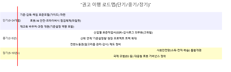 또한, 20년 전망(2040년대 중반)으로 보면, 협동로봇 안전표준과 AI 규제가 현장에 내재화되고, ‘기준 설정 노동’이 대규모 직무군으로 자리 잡을 가능성이 크다. EU형 규범이 글로벌 공급망을 통해 확산될 경우(예: 제품책임, AI 준수), 한국 기업도 수출·조달·인증의 압력으로 거버넌스를 강화할 유인이 커진다. 이때 노동시장은 “수행 직무의 축소”보다 “중간층 직무의 재구성”이 핵심 문제가 되는 것으로 -OECD의 과업 재구성 관점- 예견되고 있다.