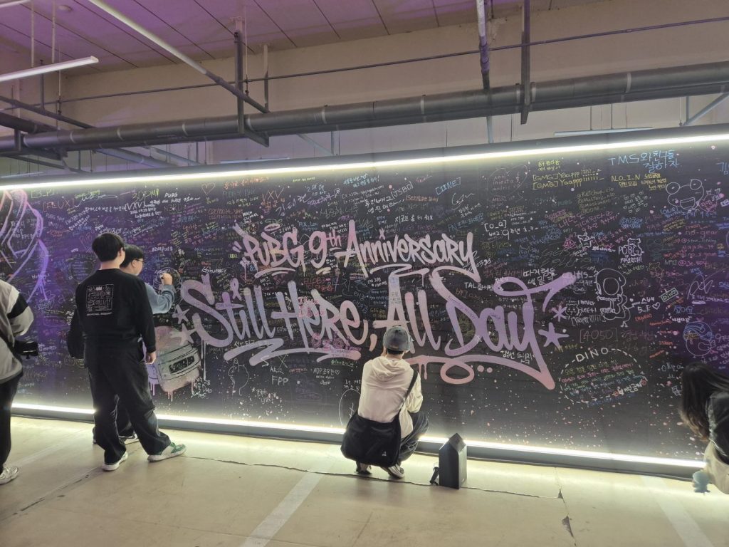 또한, 직접 게임 속 총기 모형으로 사격을 진행하는 ‘치킨맨 헌트’와 순발력을 요하는 ‘탭 투 파밍’, 그리고 ‘행운의 돌림판’ 부스 앞에는 한정판 굿즈를 얻기 위한 발길이 끊이지 않았다. 곳곳에 마련된 포토존과 9주년 축하 메시지를 남길 수 있는 ‘그래피티 월’에는 “배그 9주년 넘어 90주년 가자”, “앞으로도 배그와 쭉 함께하자” 등 팬들의 애정 어린 메시지가 빼곡히 채워졌다.