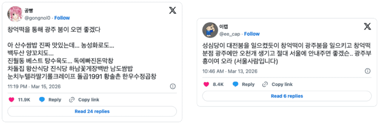 창억떡을 계기로 광주 여행을 추천하는 콘텐츠도 늘어나며 지역 자체에 대한 관심도 높아지고 있어요. 대전의 ‘빵지순례’처럼, 광주 역시 ‘떡지순례’를 통해 많은 사람이 찾는 인기 관광지로 떠오르지 않을까 기대해 봅니다.