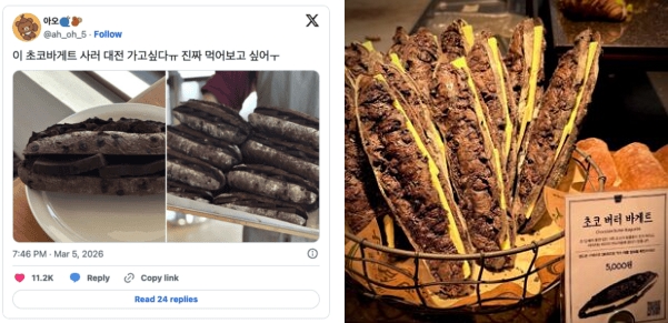X에서 바이럴 된 대전의 한 베이커리(관저당)에서 판매하는 초코 바게트가 수백만 조회 수를 기록한 데 이어, 성심당에서도 ‘초코 버터 바게트’를 출시하면서 다음 히트 디저트로 주목받고 있습니다.