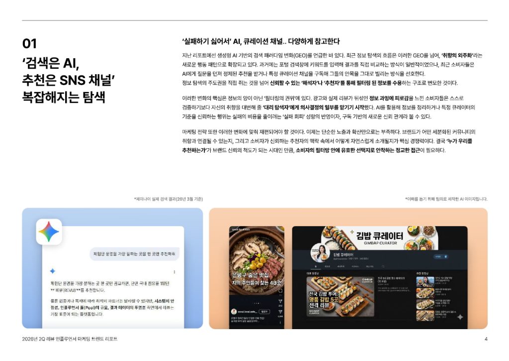 소비자들은 이제 단순 검색을 넘어 AI에게 질문하고, 신뢰하는 큐레이션 채널의 추천을 참고하며 더 정교하게 정보를 탐색하고 있습니다. 브랜드는 소비자의 취향과 신뢰 맥락 안에서 자연스럽게 발견되는 전략이 더욱 중요해지고 있습니다.