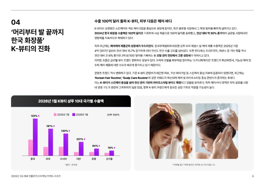 글로벌 시장에서 K-뷰티는 스킨케어를 넘어 헤어와 바디 영역까지 빠르게 확장되고 있습니다. 특히 헤어 및 두피 케어 제품과 관련한 콘텐츠 수요가 증가하며 새로운 성장 기회가 열리고 있습니다.