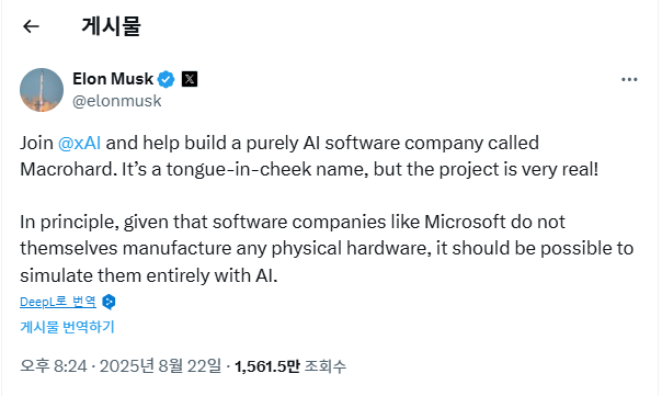 특히 머스크는 인공지능과 로보틱스의 발전이 결국 ‘돈’의 개념을 무의미하게 만들고 노동을 ‘선택 사항’으로 변화시킬 것이라고 예측한다. 그가 그리는 미래에서 노동은 생계를 위한 의무가 아니라, 마치 정원을 가꾸거나 비디오 게임을 즐기는 것처럼 개인의 즐거움을 위한 선택적 활동이 된다. 이러한 배경에서 매크로하드는 인간의 개입을 최소화하거나 완전히 배제한 채 소프트웨어를 생산하는 최초의 순수 AI 기업 모델을 지향한다. 이는 기존의 인력 중심적인 소프트웨어 개발 방법론을 정면으로 부정하며, 자본과 연산 능력(Compute)이 노동력을 대체하는 새로운 시대의 서막을 알리는 사건이다.