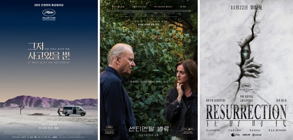 | 제78회 칸 영화제(2025)에서 그린나래미디어는 수입 작품 3편이 주요 부문을 수상하는 이례적인 성과를 거뒀다. 황금종려상은 이란 감독 자파르 파나히의 <그저 사고였을 뿐>, 그랑프리는 노르웨이 감독 요아킴 트리에르의 <센티멘탈 밸류>, 특별상은 비간 감독 <광야시대>가 받았다. 단일 배급사가 같은 회차 칸에서 여러 주요 부문을 동시에 석권하는 것은 국내 독립 수입사 역사에서 매우 이례적인 기록이다. |