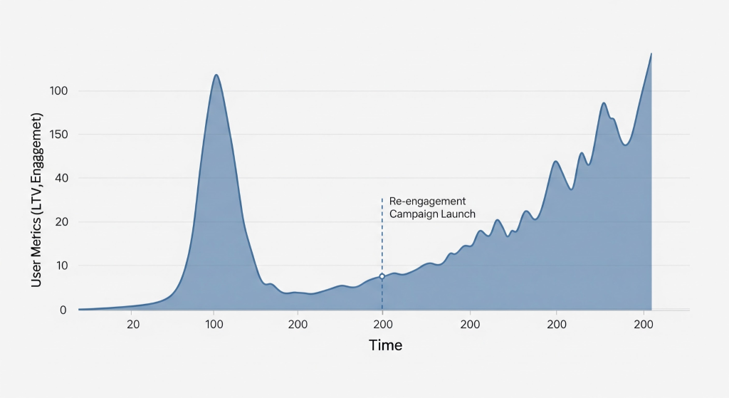 이 때문에 현재의 리인게이지먼트는 단순 복귀율보다 “복귀 이후 행동”을 중심으로 설계되는 경향이 강합니다. Google도 ACe 캠페인의 목적을 특정 인앱 액션 유도로 설명하고 있으며, Remerge 역시 최근 설치 유저, 비과금 고관여 유저, 과거 결제 경험이 있으나 최근 구매가 없는 유저 등 행동 기반 세그먼트 설계를 제안합니다. 즉 단순 오픈 유도보다 특정 레벨 재진입, 보상 회수, 재결제, 이벤트 참여처럼 더 구체적인 액션을 목표로 설정하는 방식이 성과 판단에 더 적합해집니다.